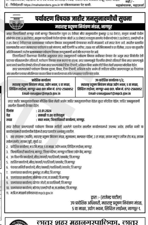 Public Hearing Date Mon, 01/22/2024 - 11:00 Public Hearing Order PH 05 Sand ghats in Nagpur District.pdf Executive Summary Executive_summery_5_sand_ghats_in_marathi.pdf Remark Marathi advertisement news paper.jpg Public Hearing Type Upcoming Hearing Year 2023